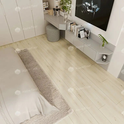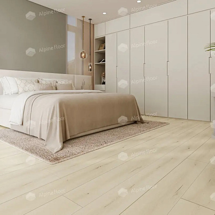 Кварцвиниловый ламинат Alpine Floor Solo Plus - усовершенствованная коллекция водостойкого SPC ламината. В качестве декоров использована вся серия Solo, только при этом производитель улучшил характеристики: увеличил толщину защитного слоя до 0,55 мм, а толщину доски до 4 мм, разместил V-образную фаску по периметру и синхронное тиснение поверхности. Полная водостойкость позволяет укладывать полы во «влажные» помещения — ванные комнаты, возле бассейнов и т.д.