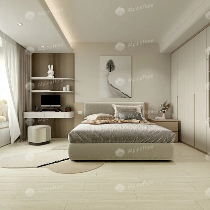 Кварцвиниловый ламинат Alpine Floor Solo Plus - усовершенствованная коллекция водостойкого SPC ламината. В качестве декоров использована вся серия Solo, только при этом производитель улучшил характеристики: увеличил толщину защитного слоя до 0,55 мм, а толщину доски до 4 мм, разместил V-образную фаску по периметру и синхронное тиснение поверхности. Полная водостойкость позволяет укладывать полы во «влажные» помещения — ванные комнаты, возле бассейнов и т.д.