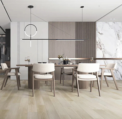 Высокий класс износостойкости, практичность и простая уборка, а также совместимость с теплым полом — те качества, за которые выбирают кварцевый ламинат, помимо эстетики SPC-покрытия.