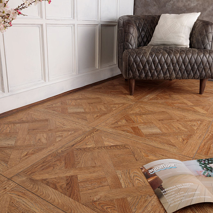 Кварцвиниловая плитка AquaFloor Versailles Glue - первая в России коллекция кварц-виниловой плитки в формате художественного паркета Versailles. Модули 600×600×2,5 мм создают аутентичный узор классицизма, идеально имитируя дорогой дворцовый паркет за счёт тиснения “в регистр” и глубокой 4V-фаски.